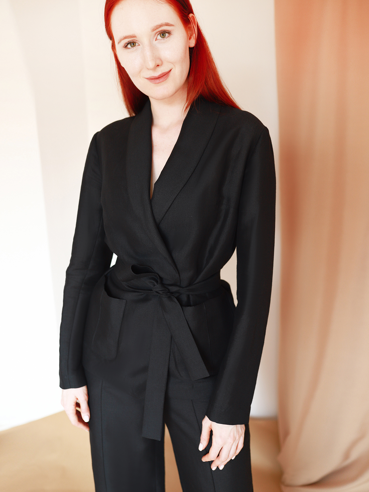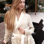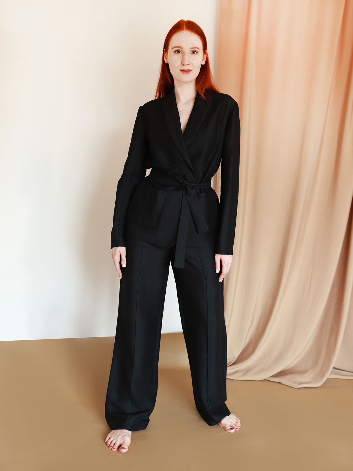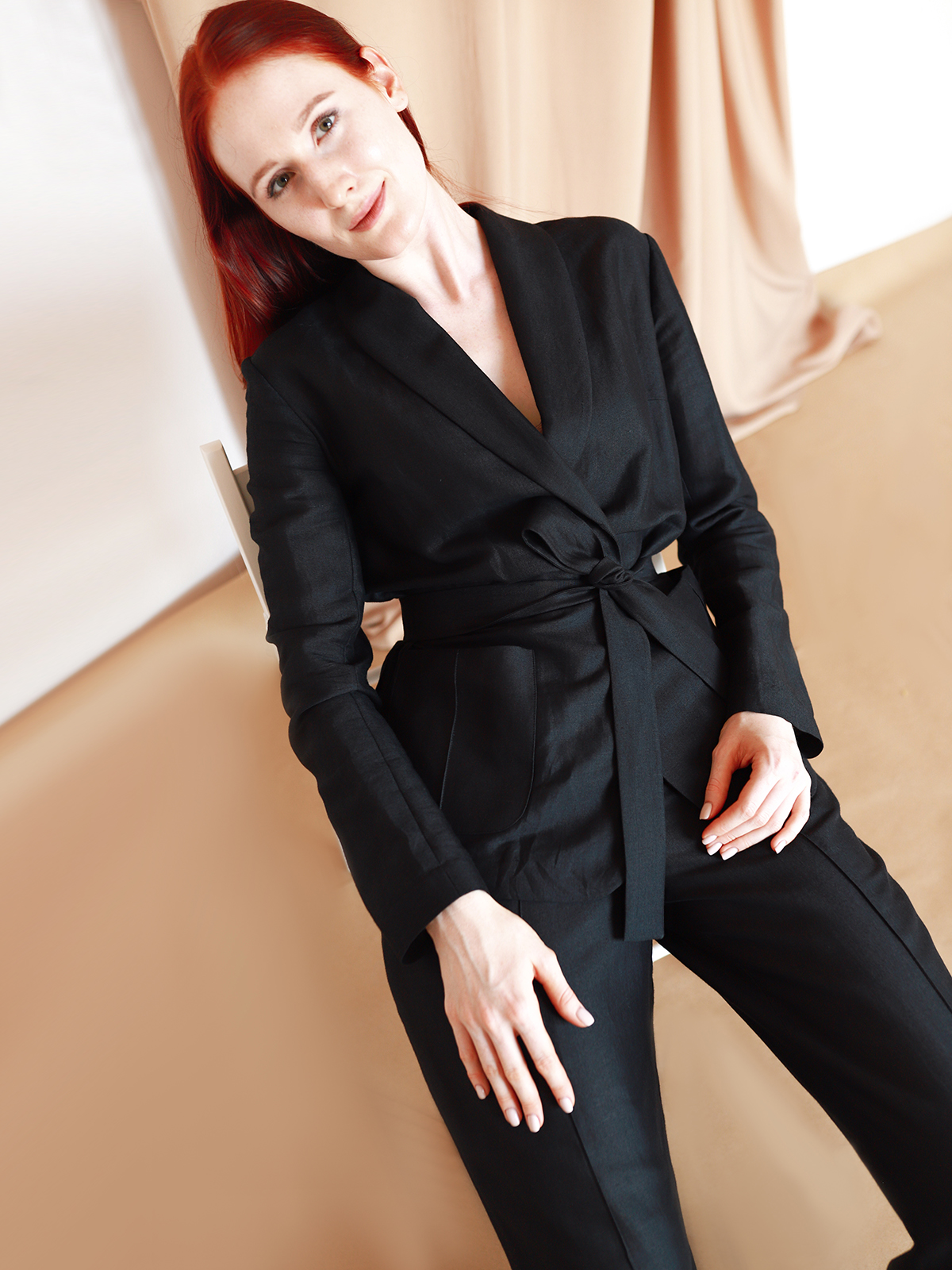 Брюки прямого силуета с фирменной прострочкой на резинке дополнены жакетом на запах с накладными карманами и шалевым воротником. Стиль, прохлада и комфорт в одном флаконе.
