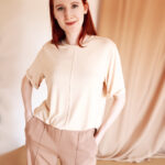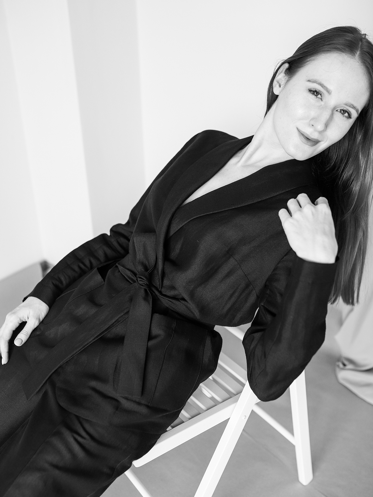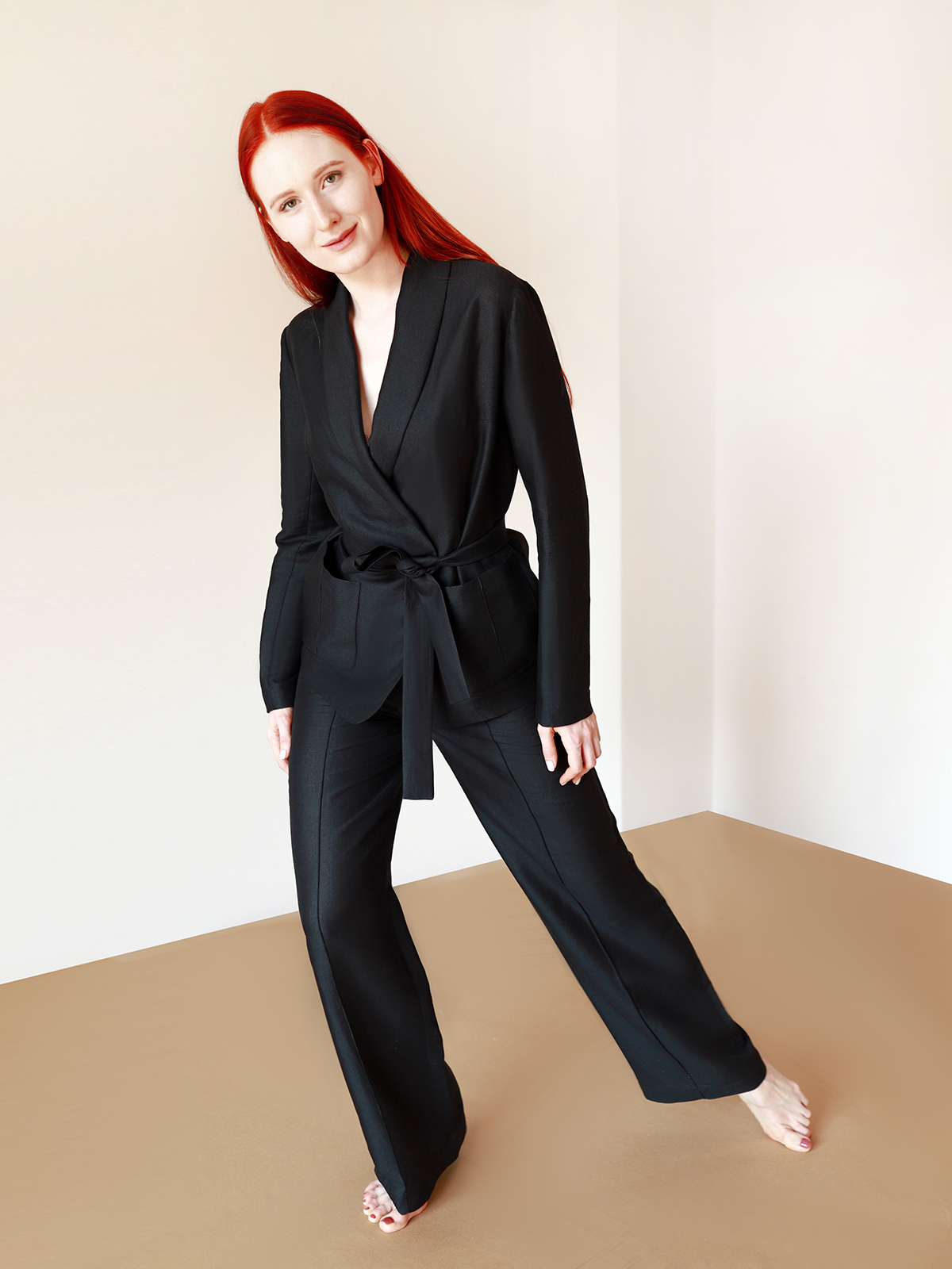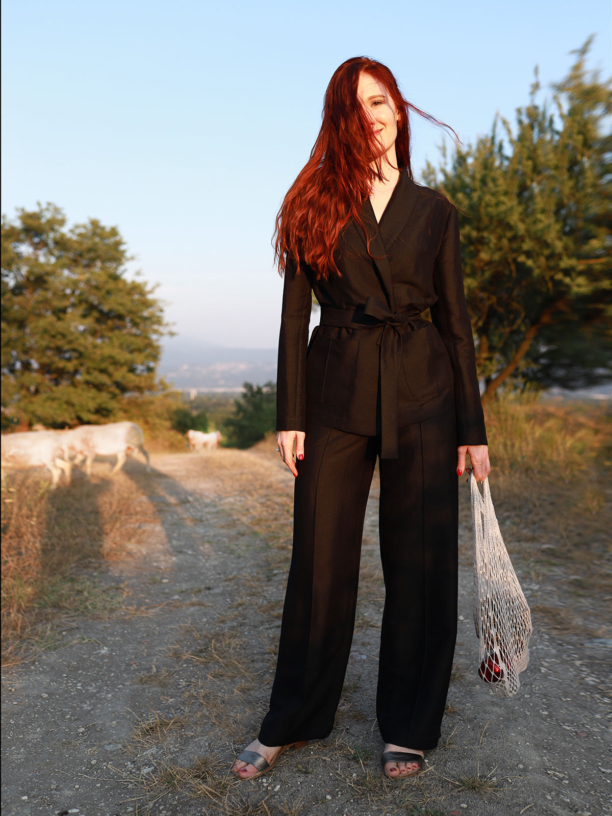 Брюки прямого силуета с фирменной прострочкой на резинке дополнены жакетом на запах с накладными карманами и шалевым воротником. Стиль, прохлада и комфорт в одном флаконе.