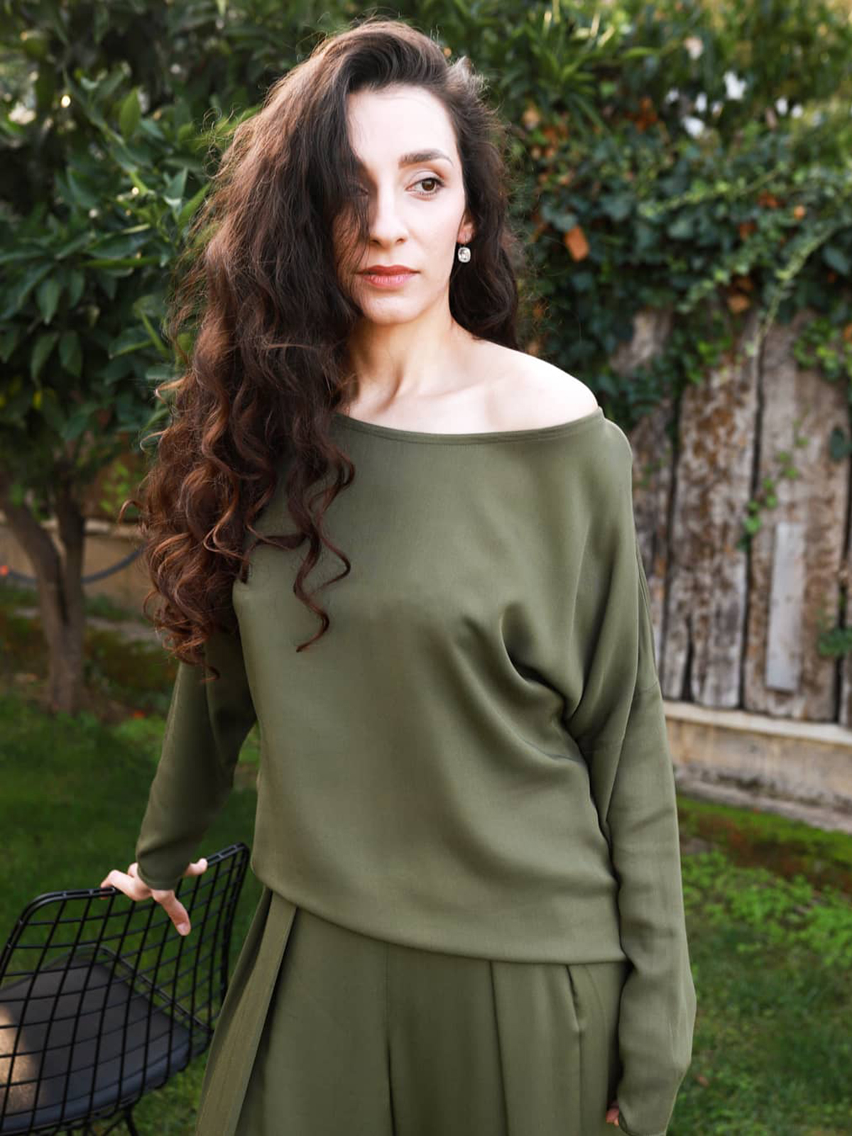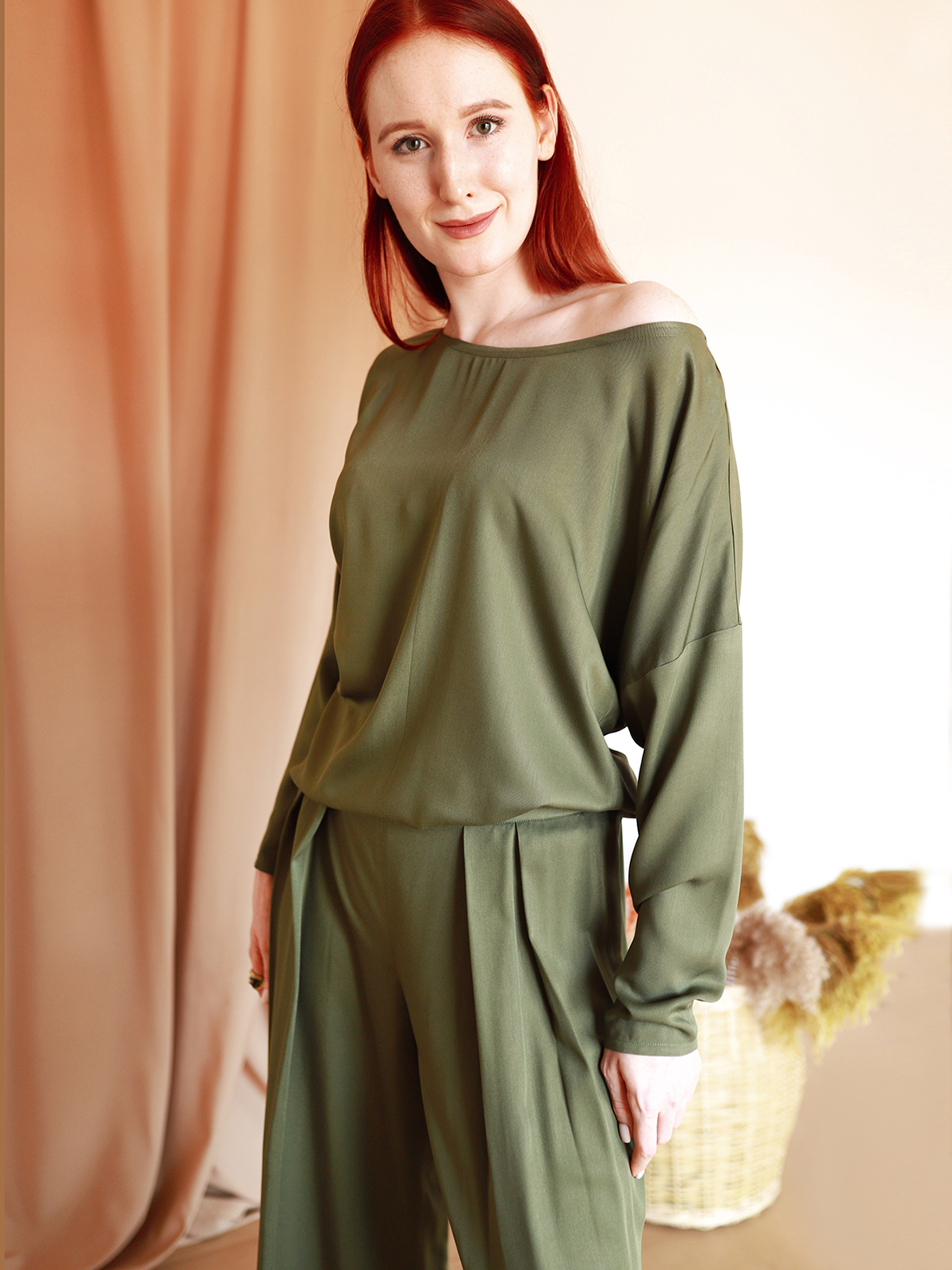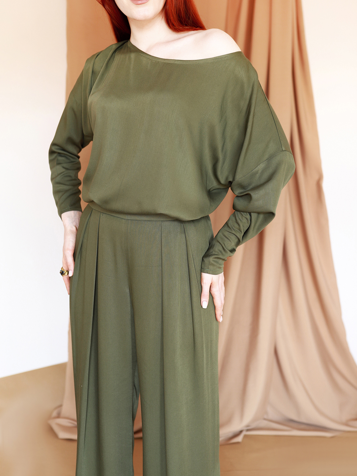 Топ с цельнокроеным рукавом и глубоким вырезом-лодочкой, который вы сможете спустить на одно плечо.