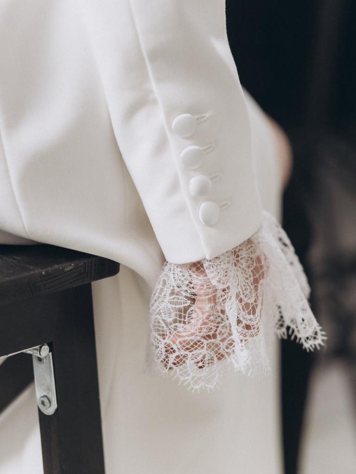 Высокие белоснежные манжеты из французского кутюрного кружева. Модель украшена застёжкой из обтянутых в тон пуговиц и навесными петлями из шёлка в тон.
