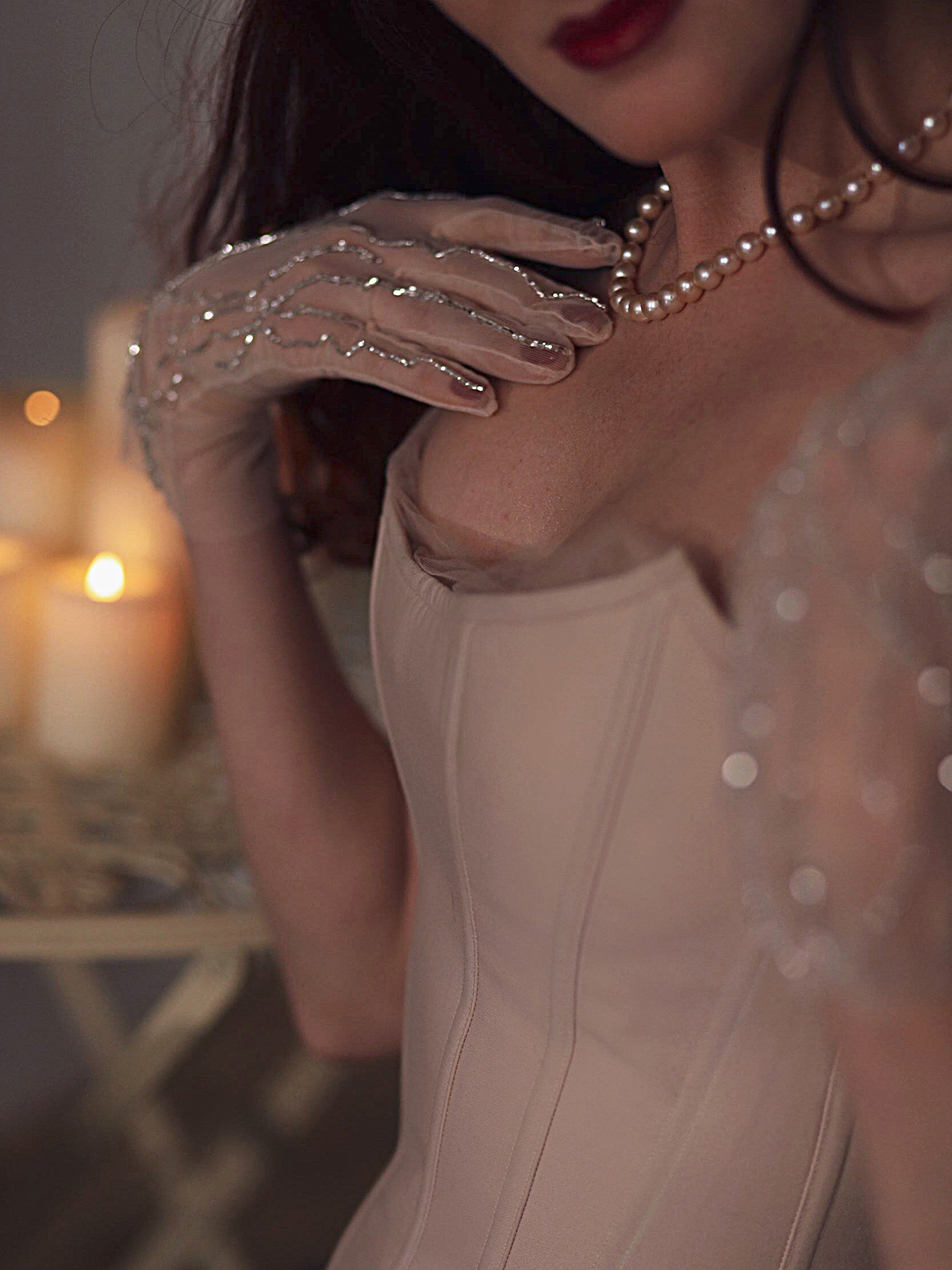 Перчатки «Эммануэль» из пудрово-розовой сетки с ручной кутюрной вышивкой люневильским крючком.