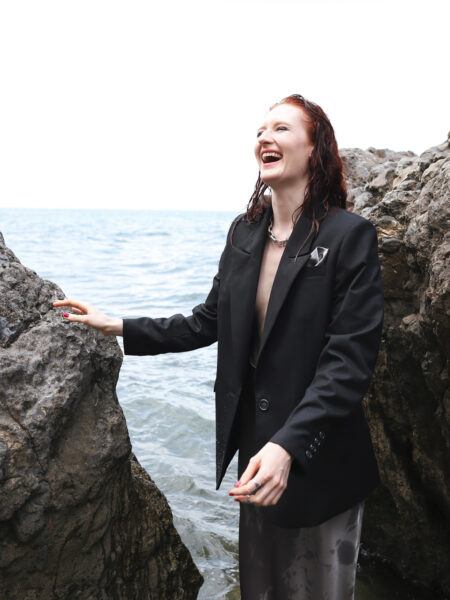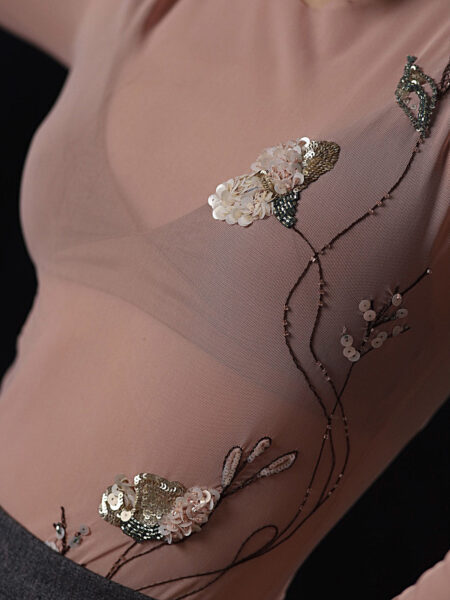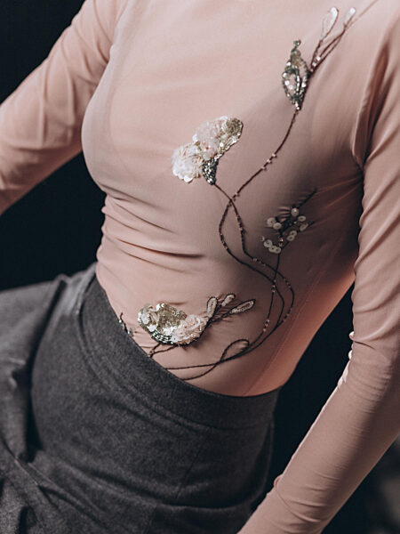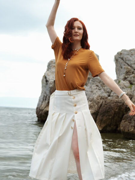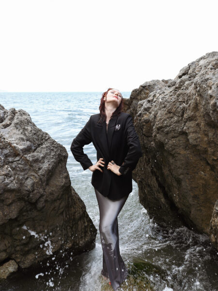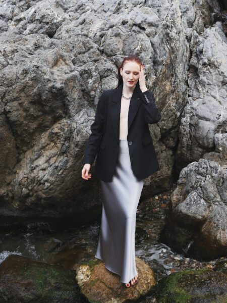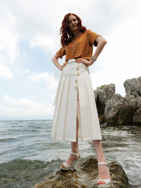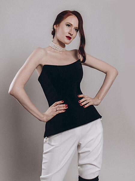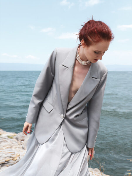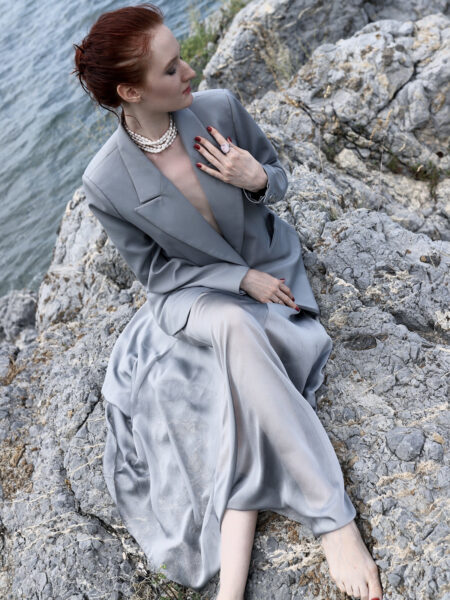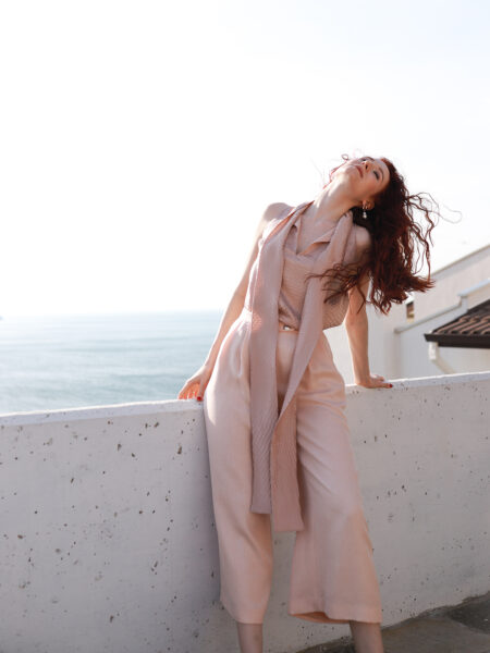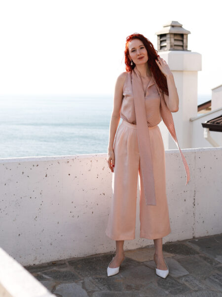 Зауженные брюки малого объёма со складками по переду изделия. Модель дополнена шёлковым поясом, что является данью истории.
